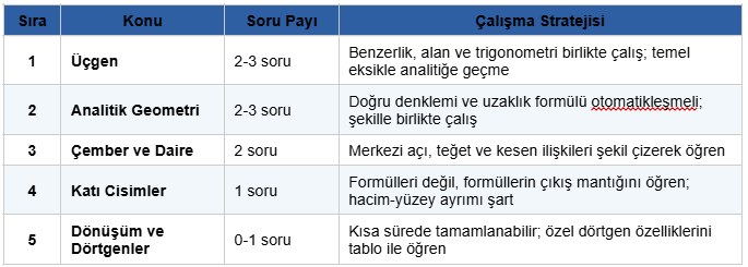 Sınava 6 aydan fazla vakti olan öğrenciler konuları tablodaki sıraya göre tamamlayabilir. Sınava 3 aydan az vakti kalanlar ise Üçgen, Analitik Geometri ve Çember üçlüsüne odaklanmalıdır; bu üç konu toplamda 6 ile 8 soruyu karşılamaktadır.
