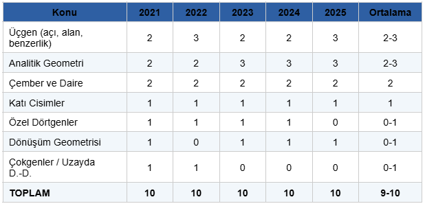 Tabloya göre Üçgen, Analitik Geometri ve Çember üç konusu toplam 6 ile 8 soruyu oluşturmaktadır. Bu üç konuyu iyi çalışan bir öğrenci 10 sorunun büyük bölümünde net elde etme kapasitesine sahiptir.