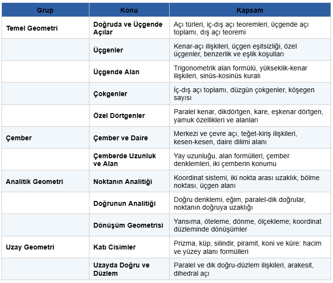 Tabloda yer alan konular ÖSYM soru havuzunda aktif olarak kullanılmaktadır. Temel Geometri grubundaki Üçgen konusu hem kendi başına soru getirdiği hem de Analitik Geometri ve Çember sorularının çözümünde araç olarak kullanıldığı için tüm gruplardaki en kritik başlıktır. Üçgen konusundaki eksikle Analitik Geometri'ye geçmek net kaybını hızla artırır.