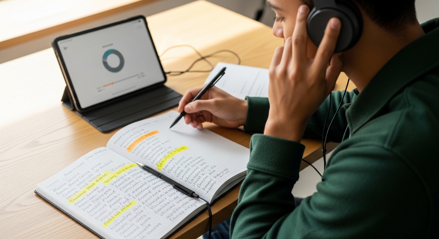 - Sonraki 10 dakika: Aynı kayıt tekrar dinlenir, transkript varsa kontrol edilir, kaçırılan kelimeler listelenir.