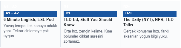 İlk tercih her zaman seviyeye uygun ve tekrar dinlemeye elverişli kaynaklar olmalıdır. Sıkıcı içerik alışkanlığı zayıflatır, çok hızlı içerik motivasyonu kırar, tekrar dinlenemeyen içerik ise öğrenmeyi kalıcı hale getirmez.